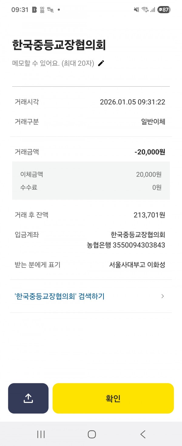 연회비 납부 확인 및 표창장 발급 요청 페이지 정보 작성자 서울대사범대학부설고등학교 조회 63회 작성일 2026-01-05 09:40 본문 서울사대부설고등학교 연회비 납부 확인 요청드립니다 :) 목록 이전글Re: 연회비 게시판 연회비 납부 확인 하였습니다 2026.01.05 다음글Re: 연회비 납부 확인 및 표창장 발급 요청 2026.01.05